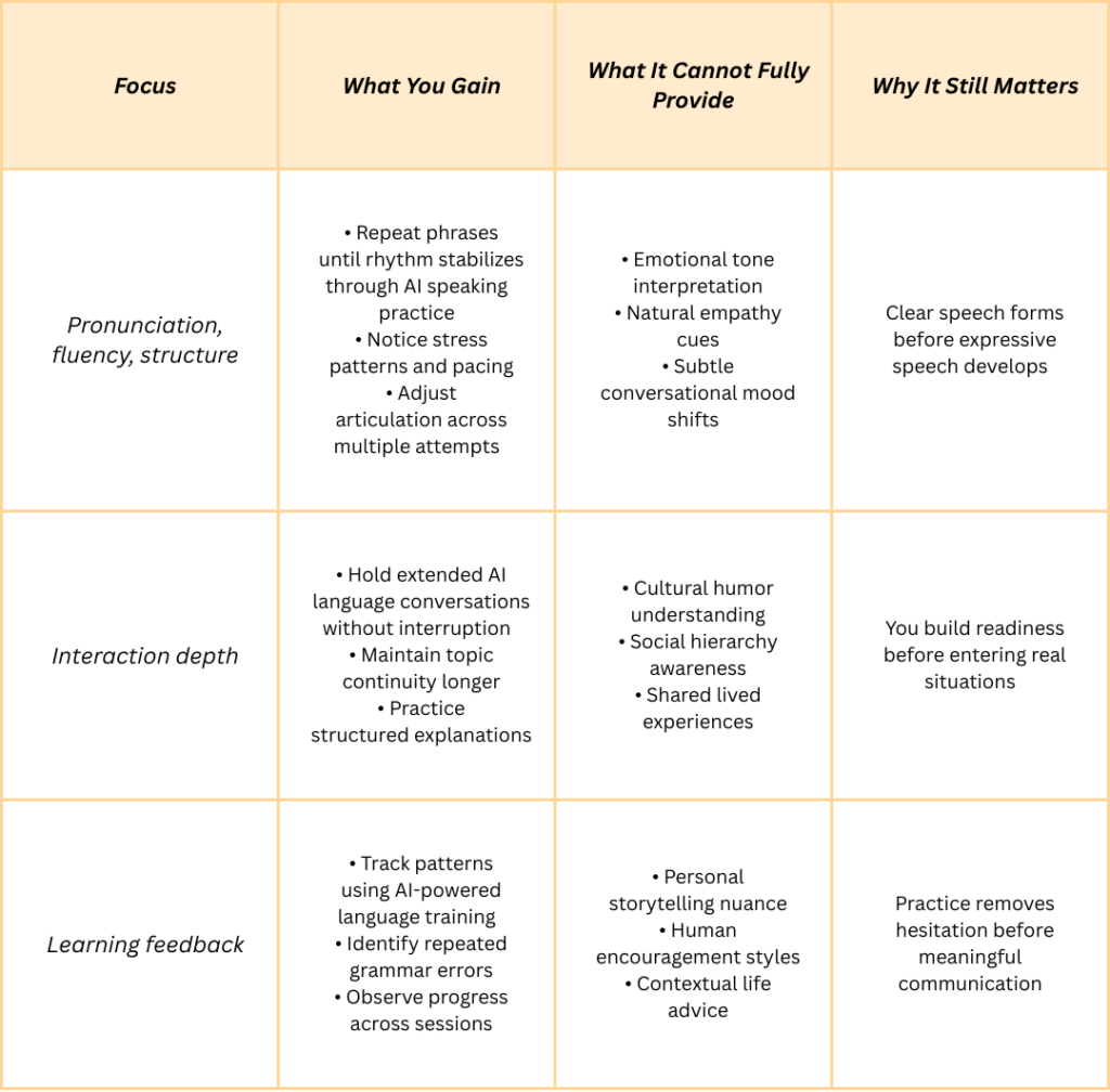 AI language conversations address those gaps by making speaking more frequent or guided, and/or measurable.